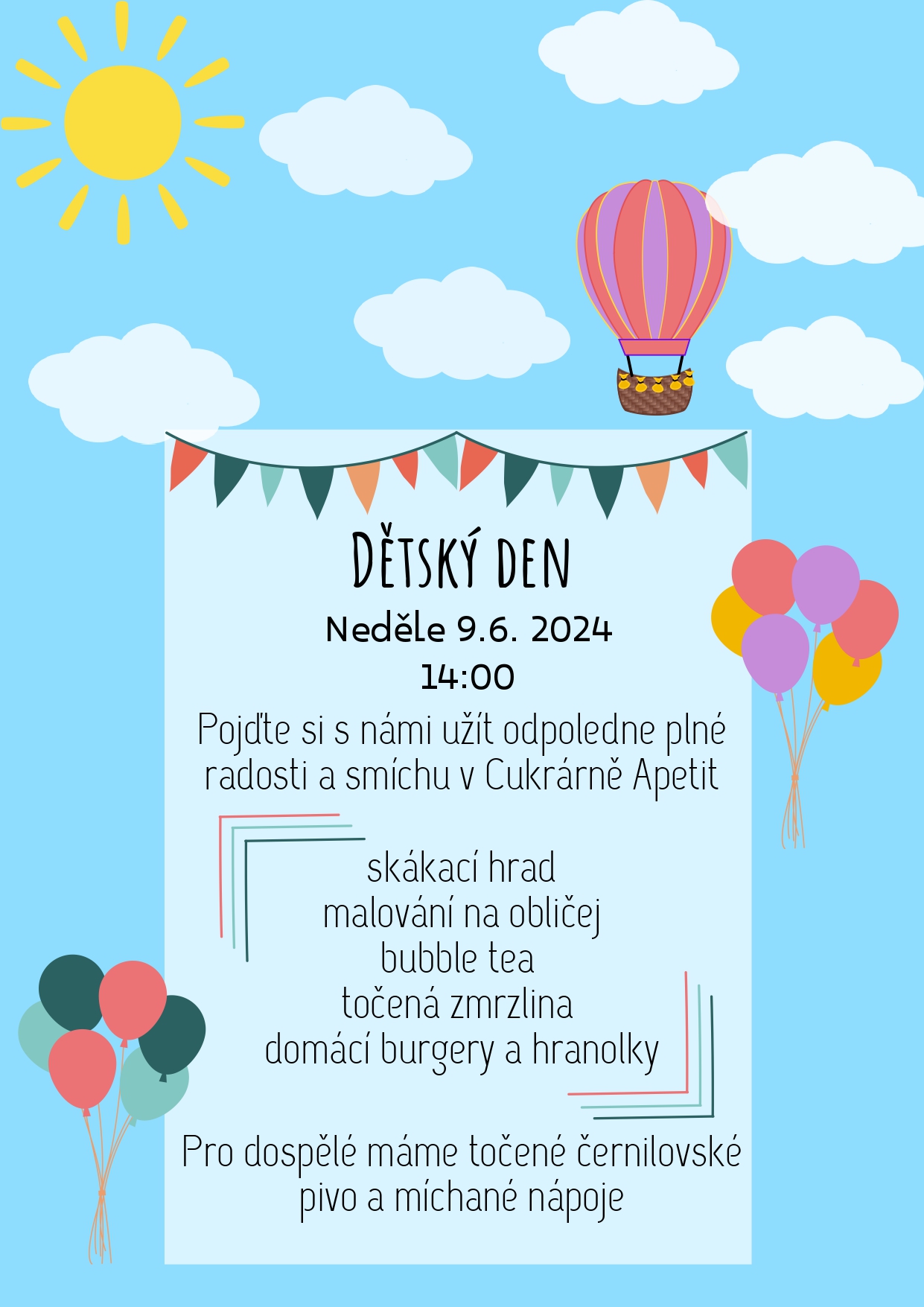 Cukrárna Apetit vás zve na dětský den, který proběhne v neděli 9. června od 14:00 hodin. Můžete se těšit na skákací hrad, malování na obličej, točenou zmrzlinu a další.